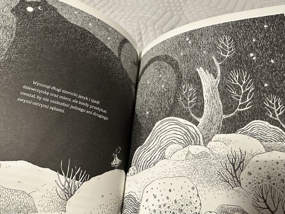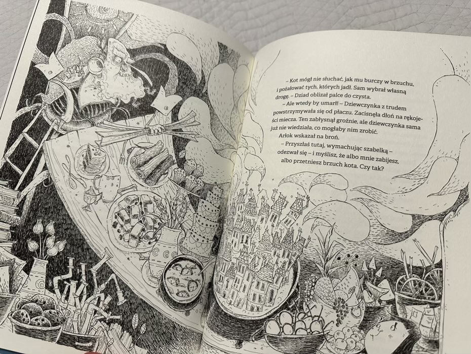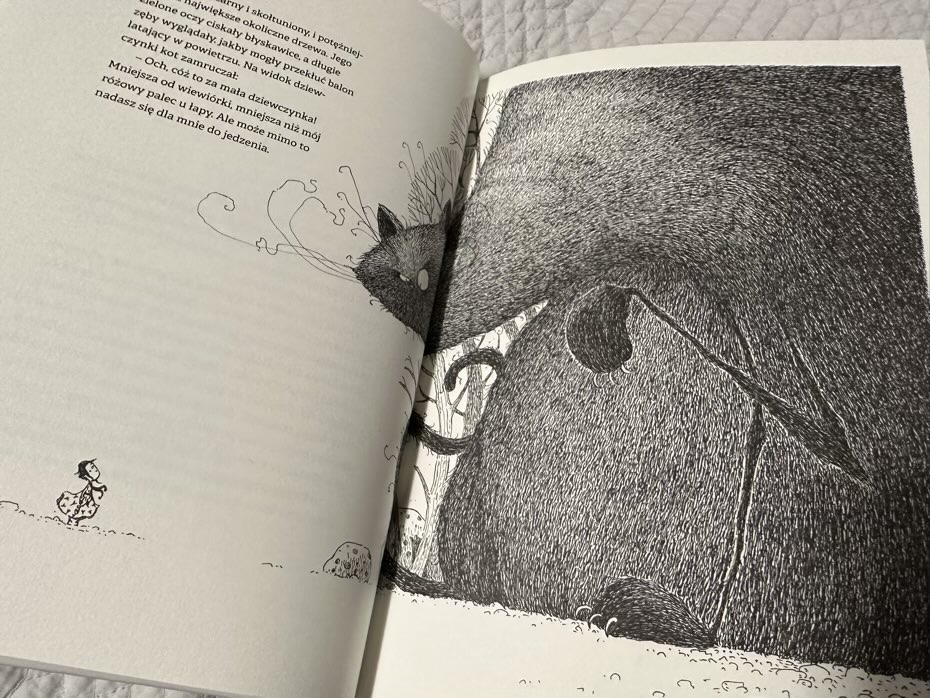 „Kot o burczącym brzuchu” to historia, która pobudza wyobraźnię, jest odpowiednio ekscytująca i zaskakująca. Książka może rozpocząć dyskusję z dzieckiem na temat chciwości, odpowiedzialności i sprawiedliwości na świecie. Czarno-białe ilustracje Teemu Juhani są dramatyczne, pełne szczegółów i tworzą dodatkową, atrakcyjną warstwę do historii. Polecam!