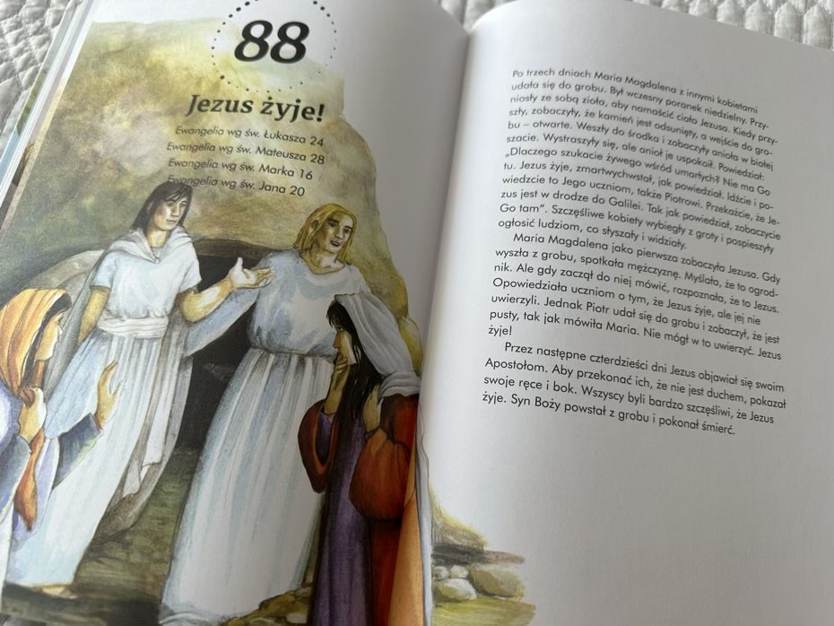 „Biblia dla dzieci w 100 historiach” jest doskonałym sposobem na poznanie najważniejszych wydarzeń ze Starego i Nowego Testamentu. Każde z opisanych tutaj wydarzeń daje dziecku okazję, aby dowiedziało się, jak bardzo jest cenne w oczach Boga. Jeśli szukacie Biblii na podarunek z okazji przyjęcia I Komunii Świętej, myślę, że to wydanie będzie idealne.