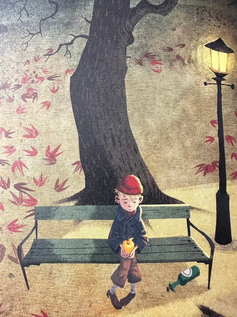 To trudna i smutna historia o samotnym chłopcu, który w zimny wieczór siedzi na ławce, patrzy na oświetlone okna, za którymi wyobraża sobie szczęśliwe rodziny i opowiada sobie bajkę o magicznej krainie.