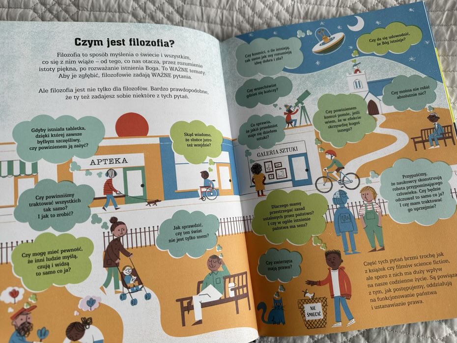 „Filozofia dla początkujących” to idealna lektura, która zachęci młodych czytelników do zadawania ważniejszych pytań w życiu. Dzięki wspaniałym infografikom oraz jasnym informacjom jest to wartościowy tytuł, który bawi i uczy. Książka adresowana jest do dzieci od lat 9., jednak uważam, że z pewnością zainteresuje również dorosłych. Polecam.