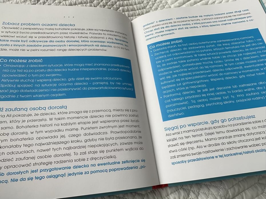 „Nie dręcz mnie! Jak poradziłam sobie z prześladowaniem” wspiera rozmowę między dorosłym a dzieckiem na temat dręczenia. Powiedzenie zaufanej osobie, że jest się prześladowanym, jest jednym z najważniejszych kroków, jakie należy podjąć, będąc w takiej sytuacji. Ważne jest również, aby rodzice, opiekunowie i wychowawcy zwrócili uwagę na wszelkie zmiany w zachowaniu i mowie ciała, które mogą przejawiać dzieci.