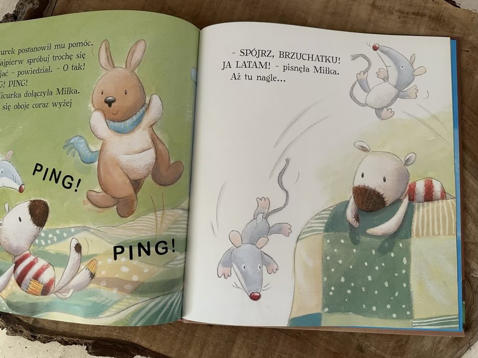 W pokoju pojawił się nowy pasiasty pluszak. Nazywał się Brzuchatek. Nikt nie wiedział, co potrafi robić, nawet on sam. Nie umiał piszczeć tak jak myszka Miłka ani merdać ogonkiem, jak piesek Drops.