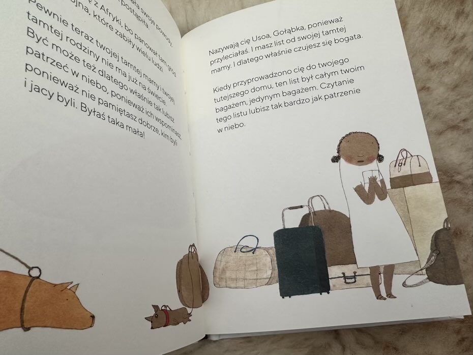 „Usoa. Dziewczynka, która przyleciała” to książka, która z pozoru ma prostą fabułę, jednak poprzez poetycki język pozwala nam dostrzec w tej historii dramat wojny, nędzy i adopcji. Proste i subtelne ilustracje, z wyraźnie określonymi liniami i niewielką ilością kolorów, łączą się z fabułą. Tytuł polecam dzieciom od 7. roku życia.
