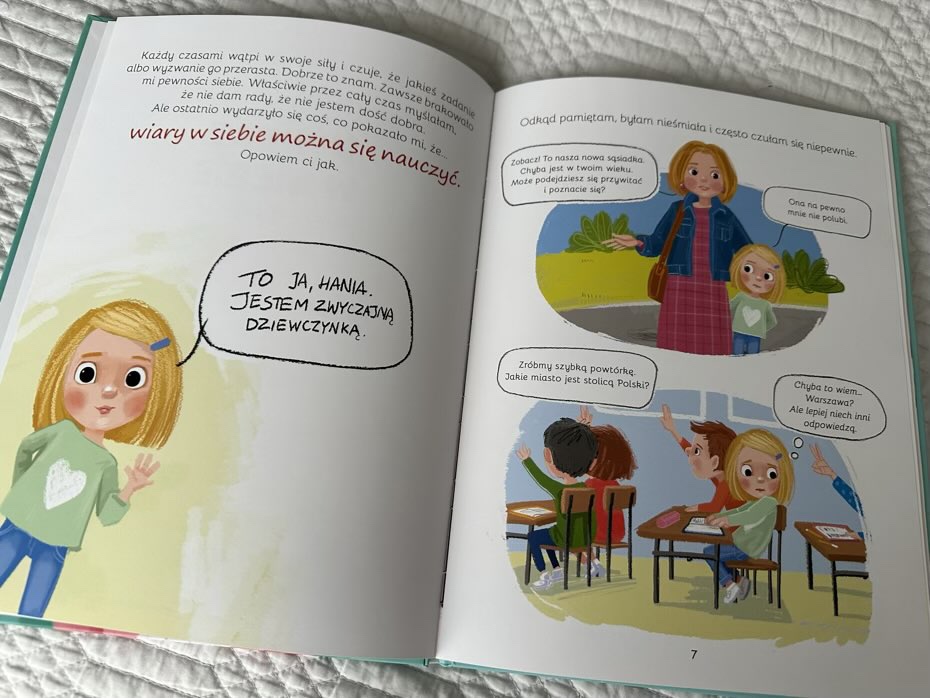 „Uwierz w siebie. Książka, która dodaje pewności” to terapeutyczna lektura opisująca dobry przykład Hani, która zrozumiała, że jest wyjątkowa na swój sposób. Uczy także, jak pielęgnować w sobie poczucie wartości od najmłodszych lat. Pobudza wyobraźnię i poczucie humoru, zwiększa miłość i akceptację dla samego siebie. Według mnie to wartościowa pozycja na rynku wydawniczym, która dodaje skrzydeł i wiary w swoje możliwości. Polecam.