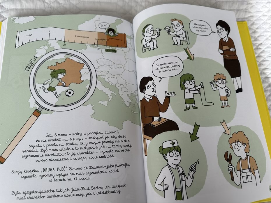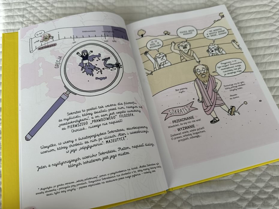 W 21 komisowych wpisach na młodych czytelników czekają opowiadania: od Sokratesa i Platona po Hannah Arendt oraz temat transhumanizmu, w tym filozofie Diogenesa, Hypatii, Montaigne’a i Kartezjusza. Z opisów bohaterów dowiemy się niesamowitych faktów z ich biografii, zobaczymy rys epoki, w której żyli i tworzyli, oraz poznamy kluczowe idee i praktyczne zasady, które można wykorzystać w życiu codziennym.