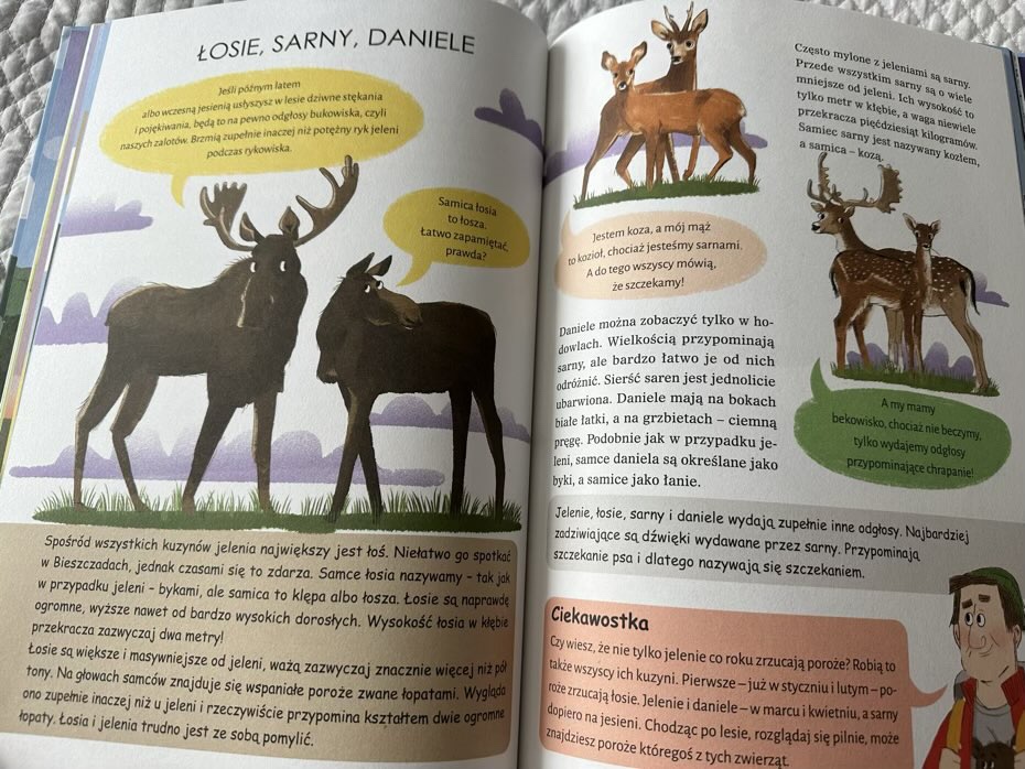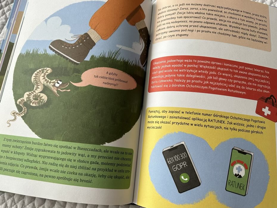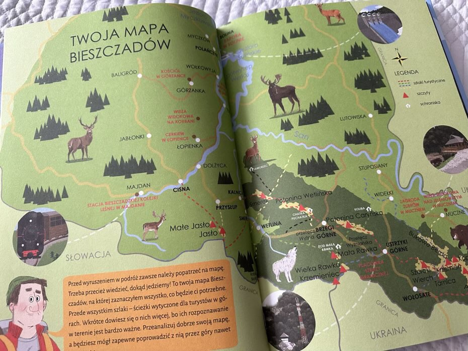 „Bieszczady. Przewodnik dla małych i dużych odkrywców” to ciekawie zilustrowany tytuł dla dzieci, który dzięki dużym rysunkom tłumaczy, co je czeka podczas zwiedzania, podziwiania i relaksu na łonie natury. Duży format, łatwy tekst, masa przydatnych informacji i interesujące wiadomości zamknięte są w twardej oprawie i ukazane nakładem Wydawnictwa Prószyński i S-ka. Lekturę polecam małym odkrywcom, miłośnikom gór, a przede wszystkim podróżnikom, którzy żądni są poznania naszej pięknej Polski.