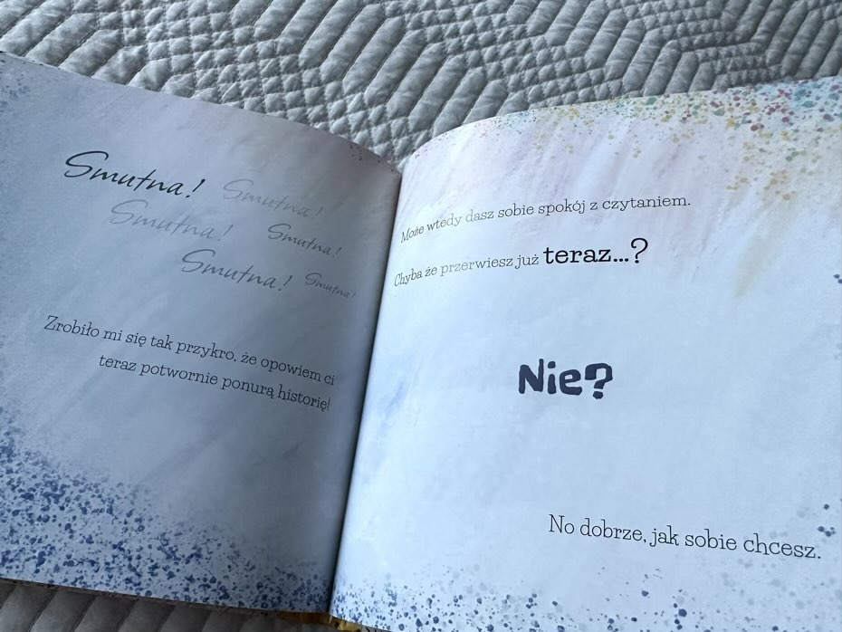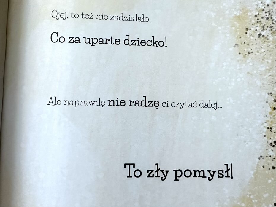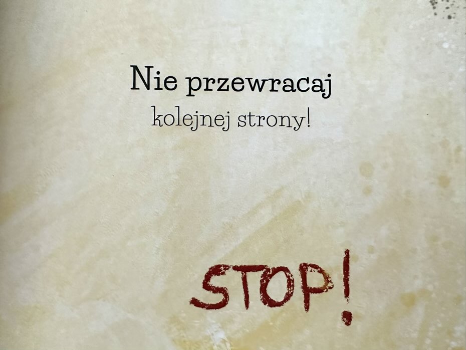 Ta książka próbuje zniechęcić dziecko. Na początku prosi, następnej straszy, aż wreszcie sprawdza, czy faktycznie czytelnik przewrócił kartkę.