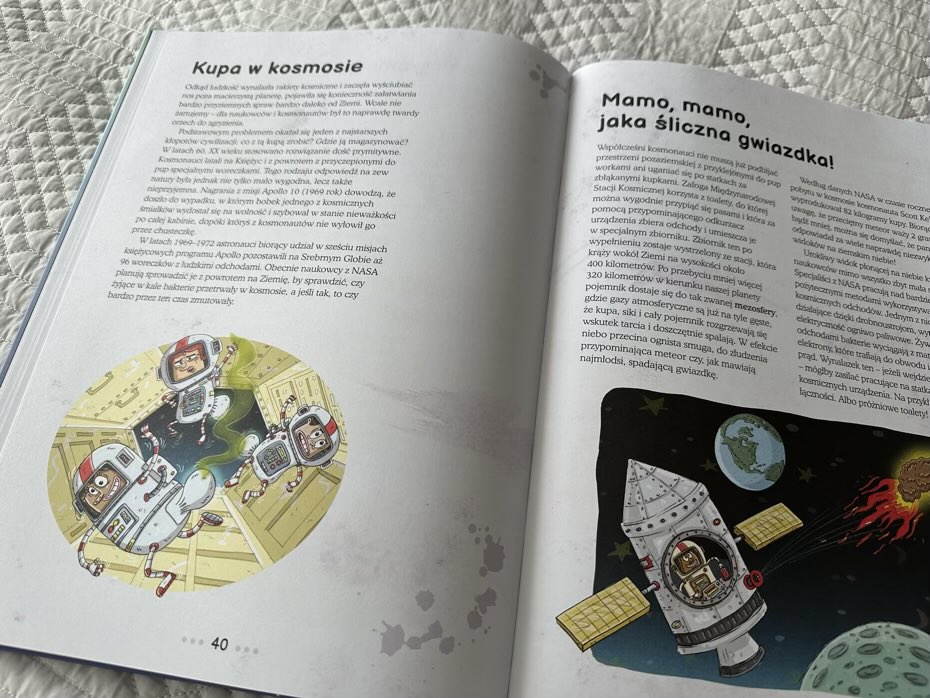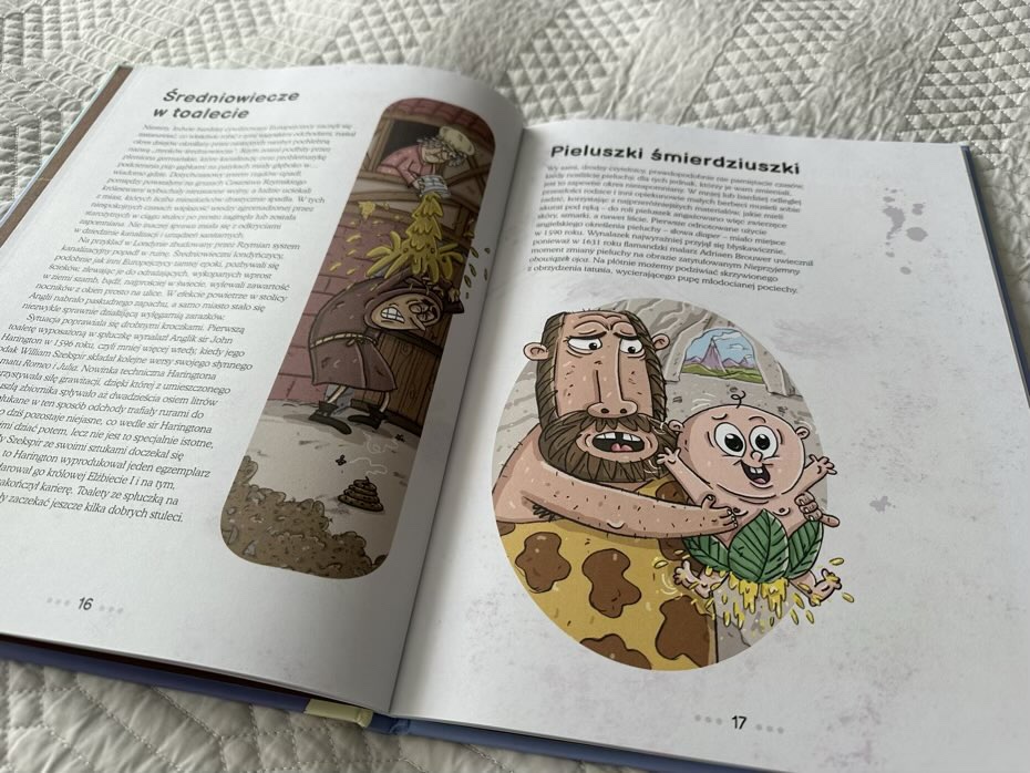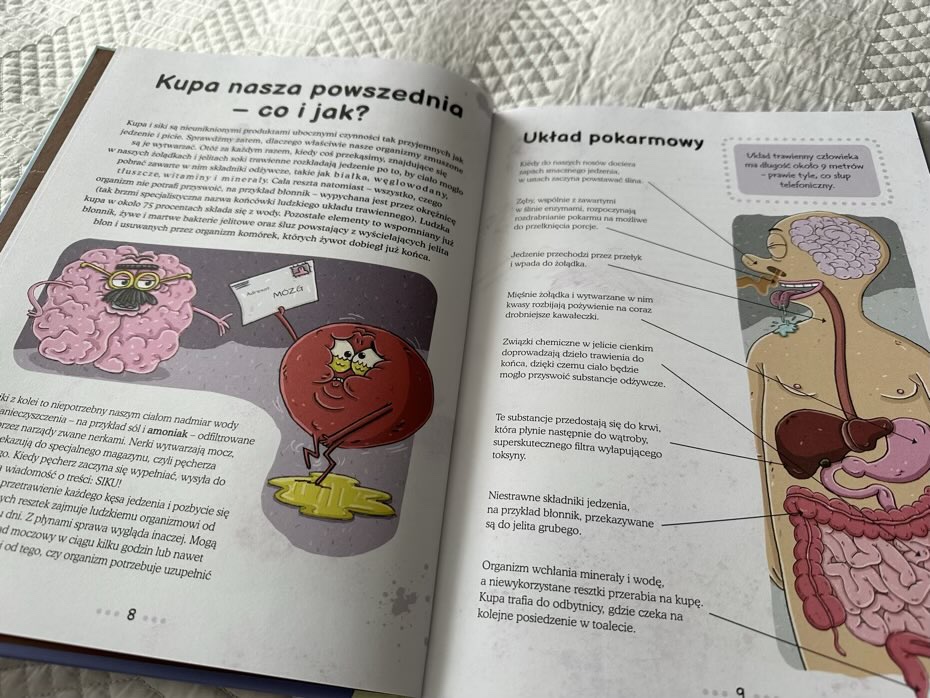 Ponadto młodzi czytelnicy przeczytają o potencjalnych sposobach wykorzystania odchodów jako paliwa, w jaki sposób astronauci robią kupę w kosmosie, zapoznają się z historią toalet od starożytnych Chin po rewolucję przemysłową i później, dokształcą się pod kątem starożytnych toalet i kanalizacji. Będą mogły także odwiedzić muzeum w Yorku, aby podziwiać ludzki koprolit czy też zasmakować herbaty z odchodami pandy.