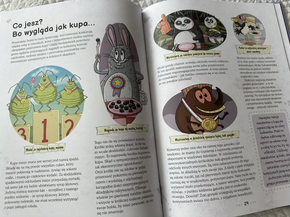 Jednak to nie wszystko, na młodych odbiorców czeka jeszcze sporo ciekawostek ze świata zwierząt. Dzieci dowiedzą się między innymi, dlaczego niektóre zwierzęta zjadają odchody i w jaki sposób kupa zapewnia im ochronę przed drapieżnikami.