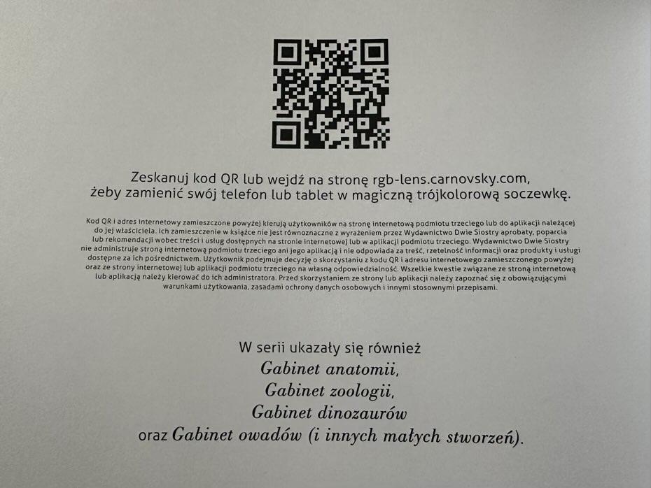 Na samym końcu książki znajduje się kod QR z linkiem, który zamieni aparat naszego telefonu w kolorowy obiektyw. Według mnie to bardzo przydatna funkcja, ponieważ dzięki wspólnemu przeglądaniu ilustracji, każdy może podziwiać wybrane przez siebie obrazy.