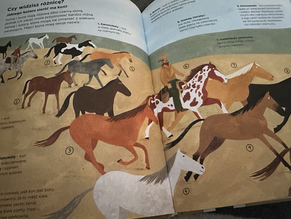 Młodzi czytelnicy poznają nazwy umaszczenia koni, imiona starszych i młodszych członków stada, relacje między ludźmi a końmi, zadania, jakie wykonują konie, które rasy są najsilniejsze, które najłatwiej szkolić i oczywiście, dlaczego konie nie potrafią między innymi bekać.