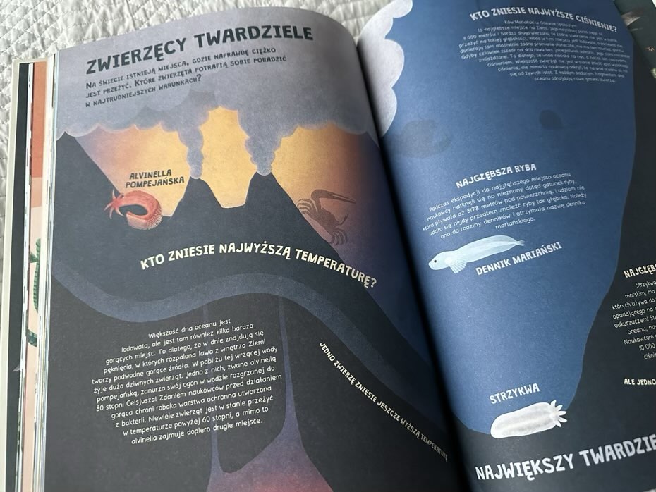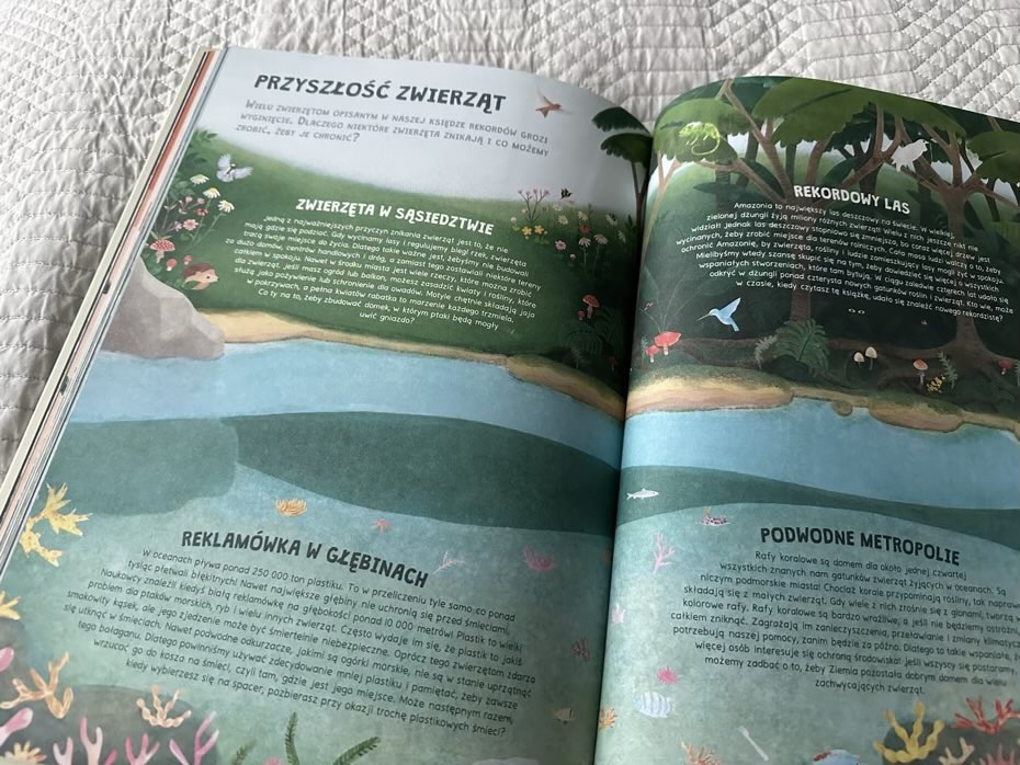 „Zwierzęca księga rekordów” to interesujący i edukujący tytuł wypełniony po brzegi ciekawostkami na różne tematy dotyczących fauny. Poza wyselekcjonowanymi kategoriami siostry Vestre przestawiły także poziom zagrożenia, przed jakim stoją dziś zwierzęta, oraz jakie działania należy podjąć, aby chronić te gatunki. Polecam.