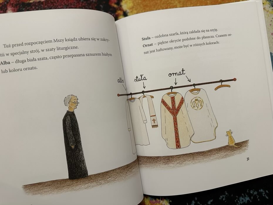 Publikacja tłumaczy młodym czytelnikom wszystkie części Mszy Świętej. Opowiada o wielu ciekawych historiach na temat dawnej i obecnej liturgii, wyjaśnia, czym jest Kościół, co apostołowie jedli podczas Ostatniej Wieczerzy, dlaczego dziś nie używa się ambony. Z treści i kolorowych ilustracji najmłodsi poznają nie tylko zakamarki kościołów, naczynia i szaty liturgiczne, ale również dowiedzą się, jak dawniej wyglądały świątynie. Dzięki prostej formie dzieci zwrócą uwagę na kolejne etapy liturgii i dowiedzą się, jak w nich uczestniczyć.