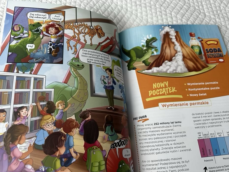 Wraz z zabawkowymi bohaterami możemy poszerzyć wiedzę o prehistorycznych gadach i geologii. Znajdziemy tu informacje o budowie dinozaurów, ich ewolucji i skamielinach. Poznamy różnicę między zwierzętami stałocieplnymi i zmiennocieplnymi oraz dowiemy się, o które współczesnych stworzeniach pochodzących od dinozaurów.