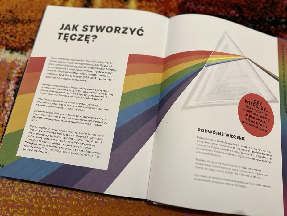 „Tęcza w kosmosie” to książka zawierająca wszelkiego rodzaju pytania dotyczące nauki i kosmosu. Zawiera wiele interesujących faktów, a jednocześnie napisana jest w sposób, który nie powinien zanudzić dziecka. Jest to pouczający tytuł, łatwy w odbiorze, prosto napisany. To ciekawa książka, która może zdradzić młodym czytelnikom tajemnice kryjące się za kolorami i światłem. Polecam.