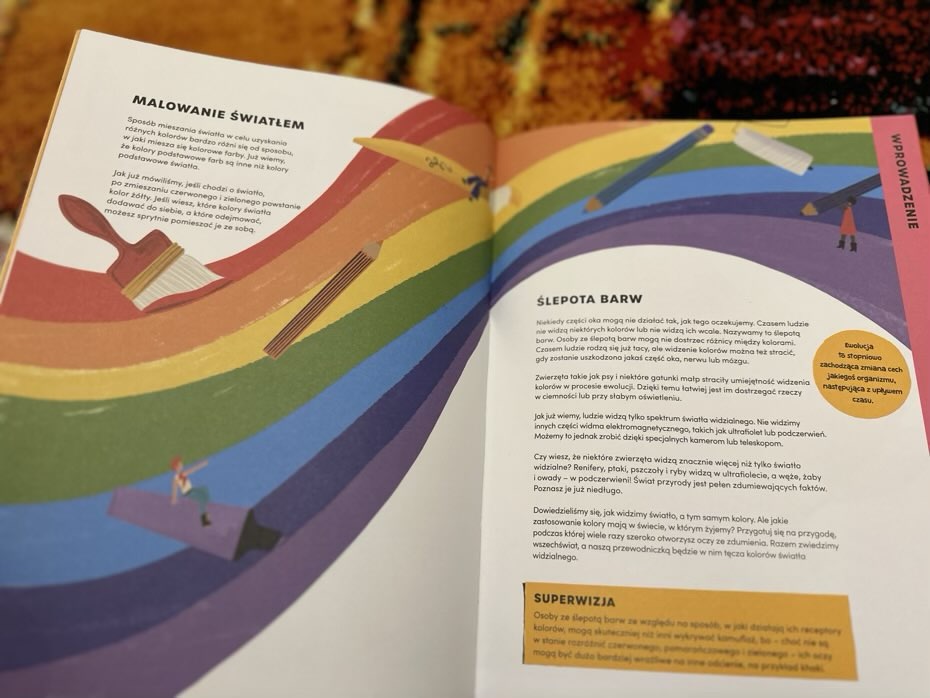 Jest to książka mieniąca się radośnie kolorowymi faktami, pobudzającymi ciekawość młodych czytelników. Zawiera instrukcję wykonania tęczy w przestrzeni i pokazuje, jak wiele możemy się dowiedzieć o naszym kolorowym świecie i tym, jak go widzimy.