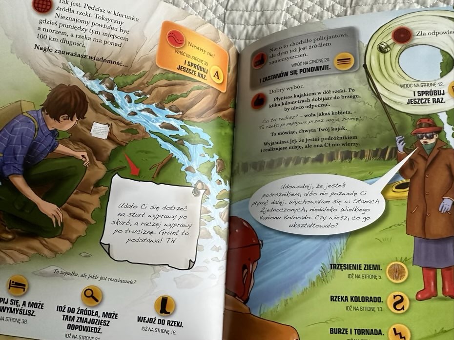 Pytania są starannie dobierane tak, aby dotyczyły podstawowych przedmiotów geograficznych dla danej grupy wiekowej. Znalezienie odpowiedzi umożliwia czytelnikowi przechodzenie przez historię i z każdym krokiem dowiaduje się więcej o geografii.