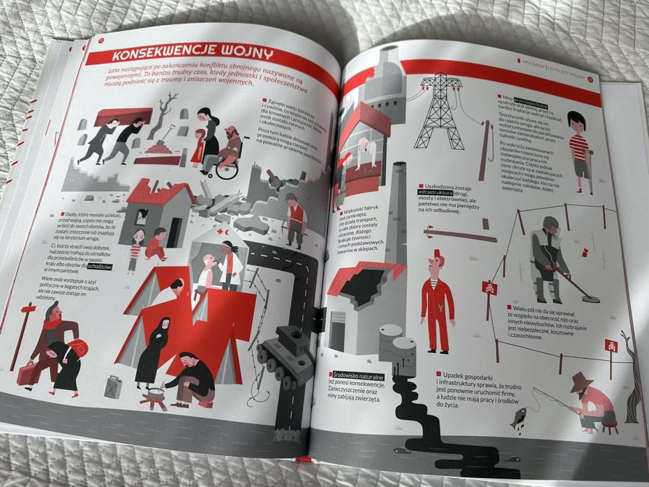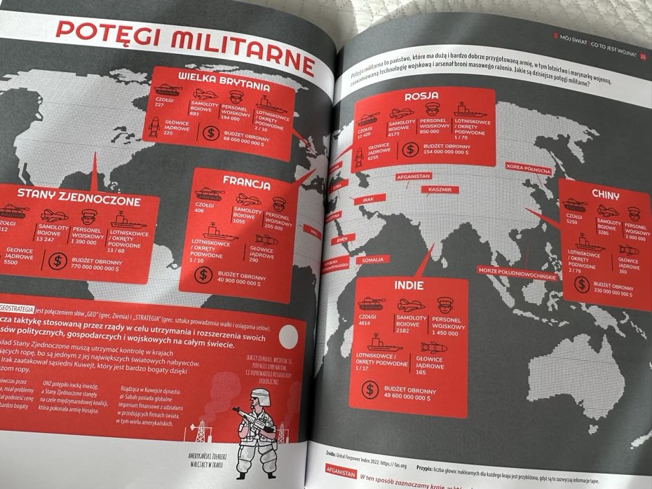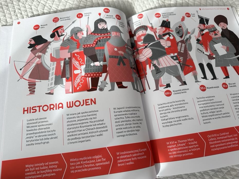 Autor w książce uwzględnia nie tylko współczesne wojny, ale znajduje się tam też wyjaśnienie, czym jest NATO, czym zajmowało się w przeszłości i co robi obecnie. Cały ten materiał jest podzielony na bardzo krótkie sekcje z doskonałą grafiką, dzięki czemu jest bardzo przystępny dla każdego czytelnika. Na każdej rozkładówce omówiono wiele aspektów wojny.