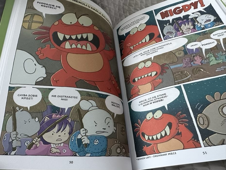 “Chibi Usagi. Atak chibi straszydeł” to prosty i przystępnie napisany komiks autorstwa Julie i Stana Sakai, który zachwyca kolorami i grafiką Chibi. Tytuł świetnie się spisuje, nie tylko uchwycając bardziej przyjazną dzieciom wersję Usagi Yojimbo, ale także pokazuje ważne przesłanie, że nawet wielkie bogactwa nie są warte życia przyjaciół. Jest to fajna historia o przyjaźni i pomaganiu innym, którą polecam młodym czytelnikom od lat 5.